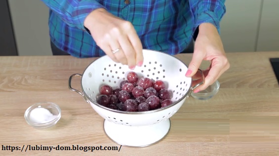 Затем побрызгаем их уксусом, слегка посыплем солью и пищевой содой. Сито хорошо встряхнем несколько раз, чтобы уксус, ода и соль попали на все плоды, а потом промоем ягод под проточной водой.